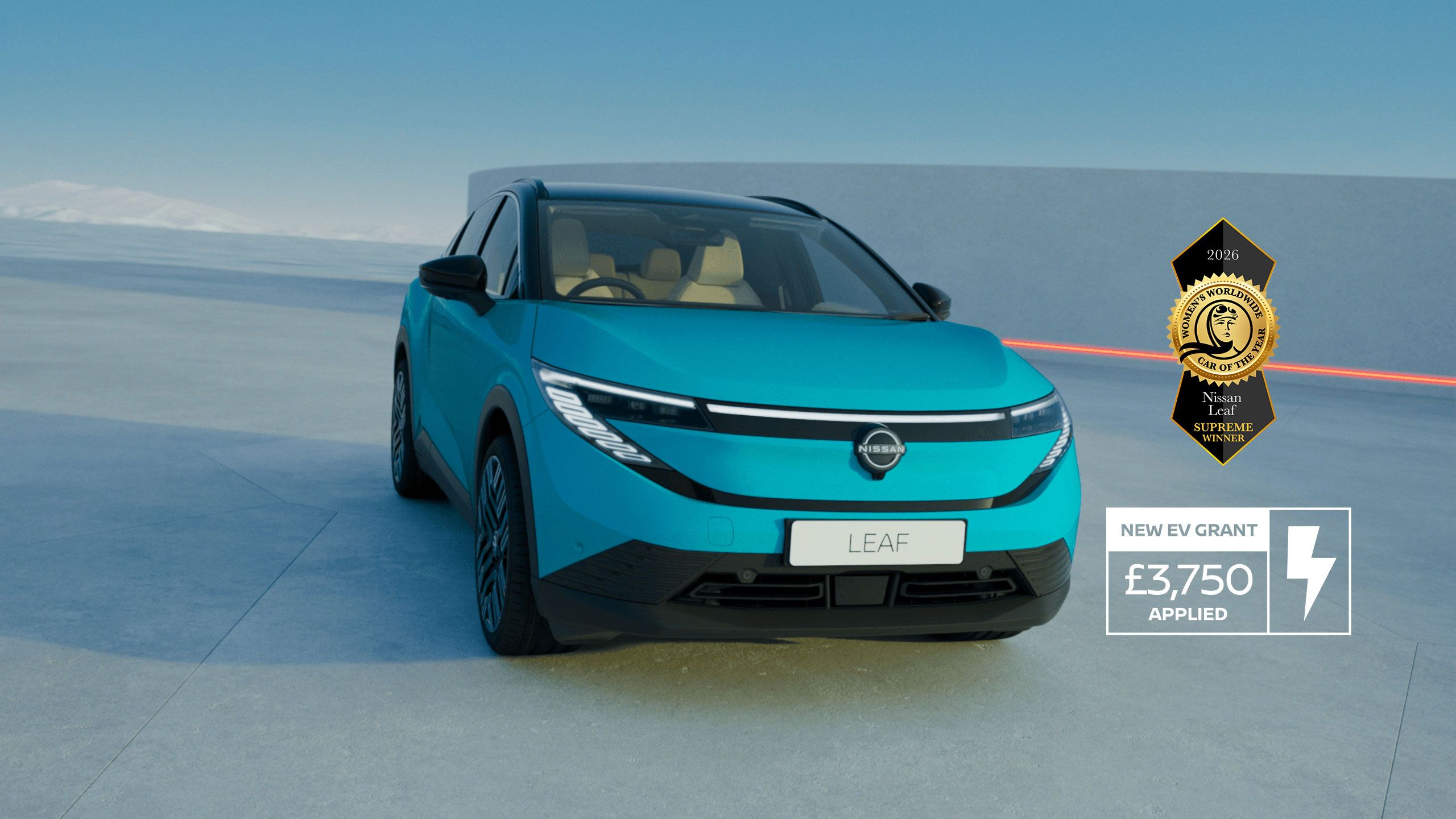 * Recommended on the road price includes VAT, Vehicle Excise Duty, First Registration Fee, and Electric Car Grant (ECG) of £3,750. ECG scheme subject to UK Government terms and conditions. Prices ranging from price of £32,249 is based on a Nissan LEAF 75kWh Engage excl. cost of optional paint & personalisation. In some instances, photos are of non-UK specification vehicles and do not represent a specific model, grade or offer. Please contact your dealer for full specification details.